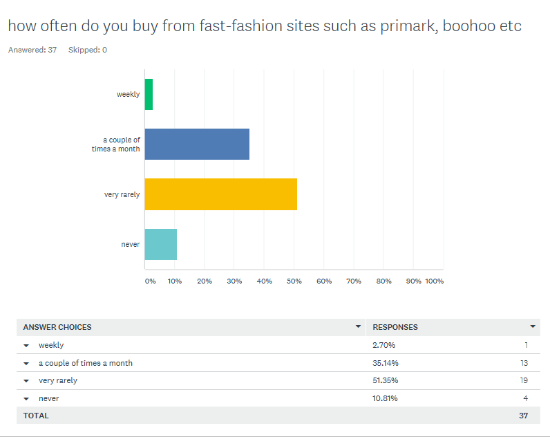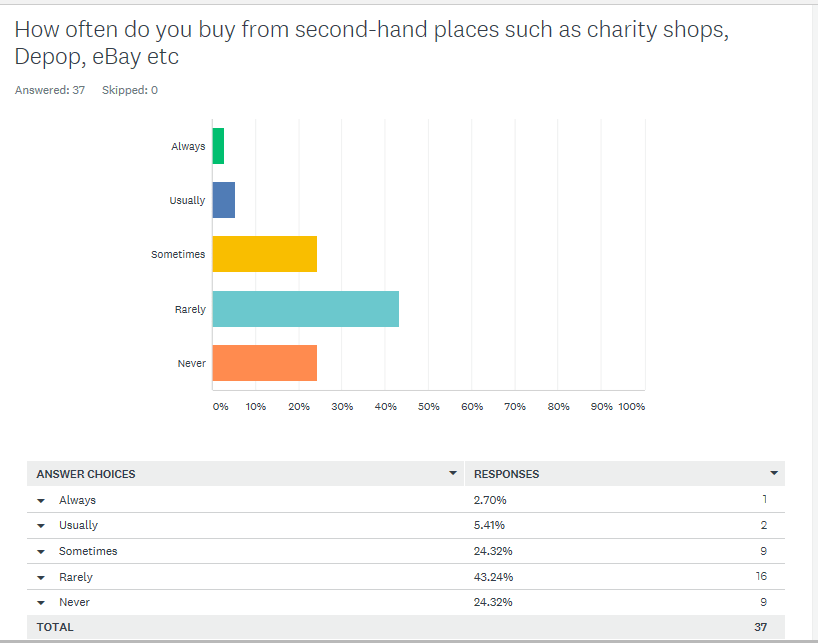However, the recent survey found that 51.35% of people rarely buy from fast fashion places, but the majority of the people who took the survey said they rarely bought clothes second hand from charity shops and Depop.